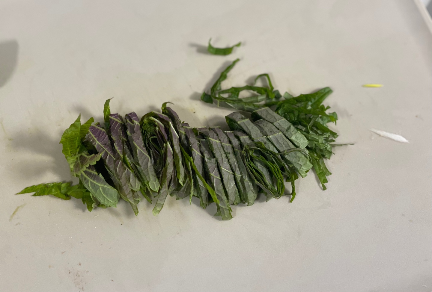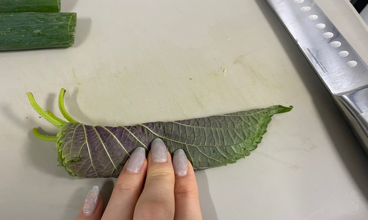 그리고 깻잎네장을 돌돌말아주어 얇게 채썰어서 준비해주세요.
