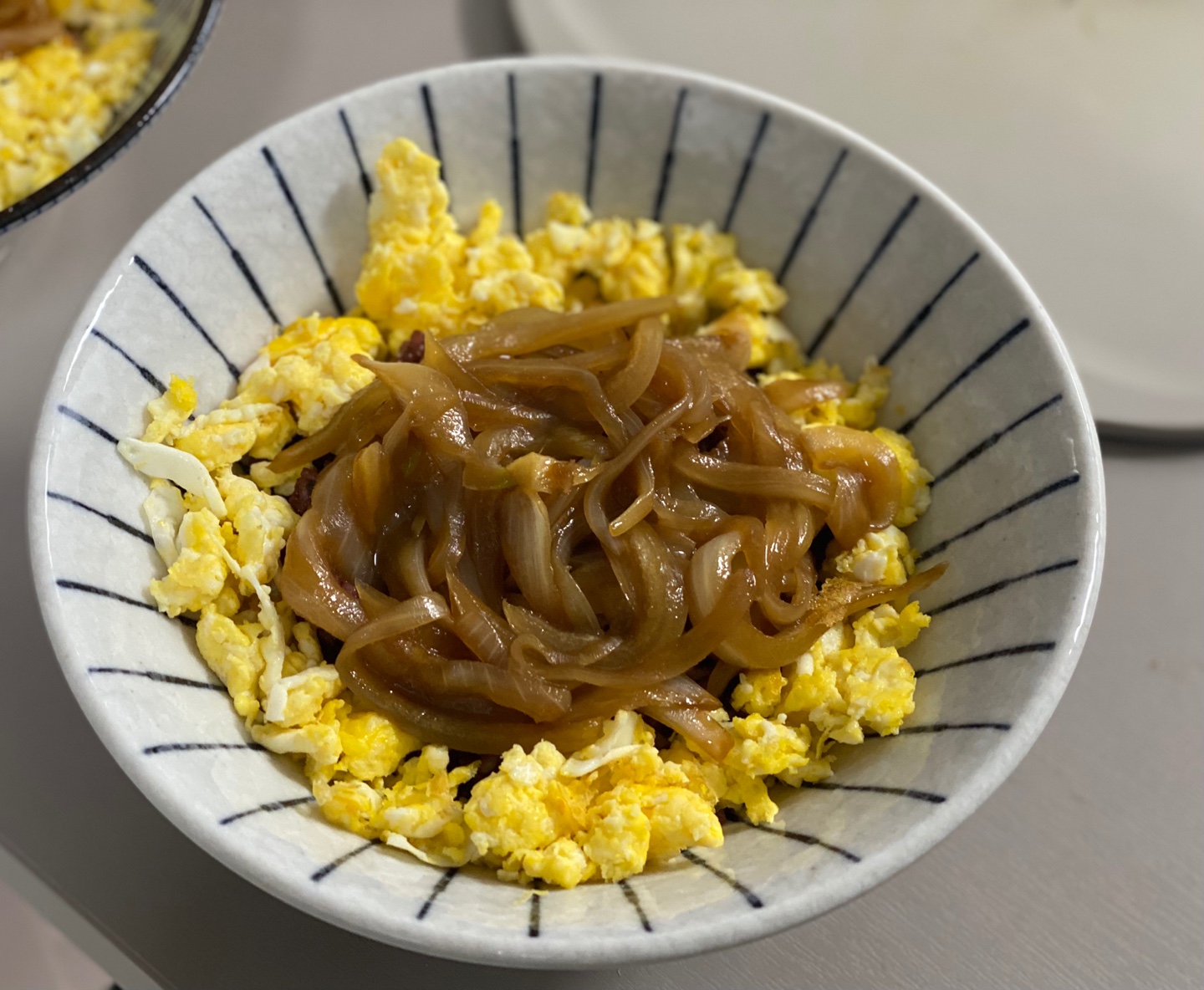 먼저 그릇에 밥을 평평하게 담아주고, 만들어준 스크램블을 바깥쪽으로 쭉 둘러줍니다.