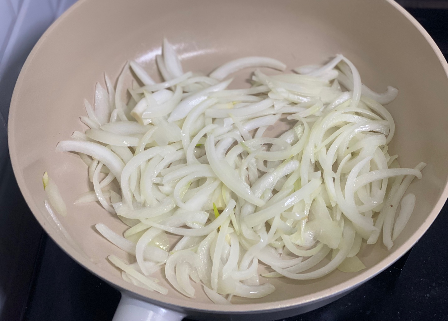 팬에 기름을 살짝 붓고, 길게 채썰어준 양파를 넣고 볶아줍니다.
